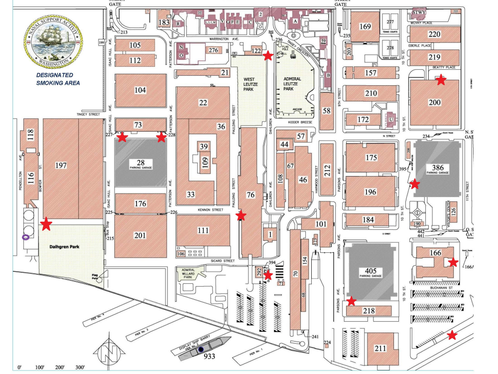 Naval Support Activity Washington has set the designated smoking areas on the Washington Navy Yard at the locations indicated by red stars on the map below.